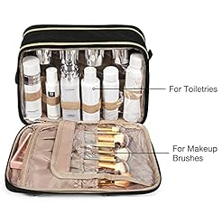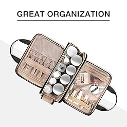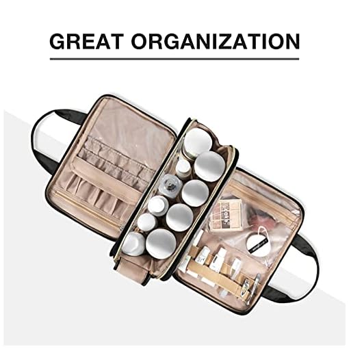Double Side Full Open Design: Double side full open design keeps cosmetic bottles can stand upright in the middle compartment. Both sides pockets are design for makeup brushes, eyeshadow palette and other cosmetics