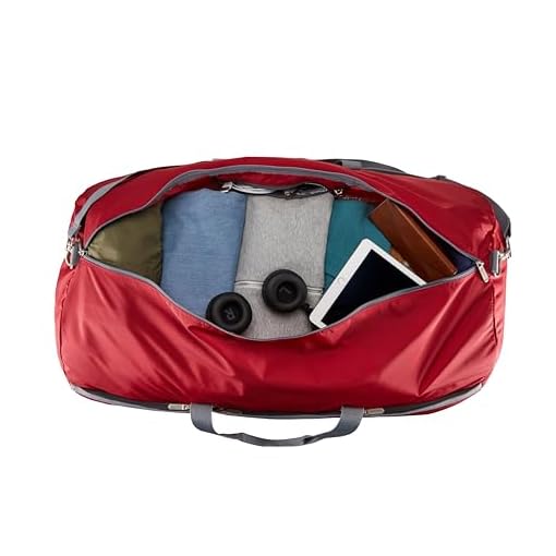 Red, large rectangular-shaped duffel bag with roomy interior (over 6,000+ cubic inches); ideal for travel or storage