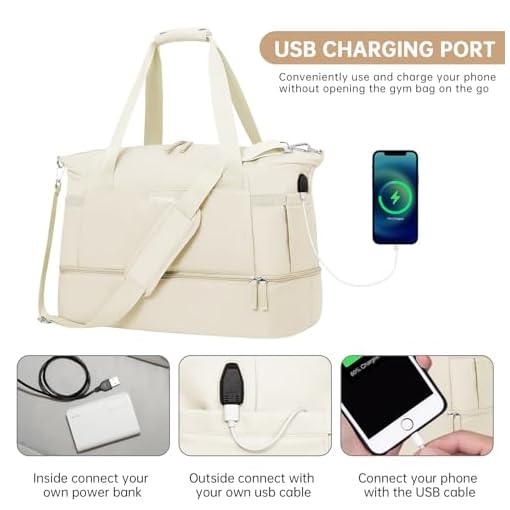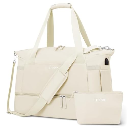 ETRONIK Gym Bag for Women, Travel Duffel Bag with USB Charging Port, Weekender Overnight Bag with Wet Pocket and Shoes Compartment for Women, Travel, Gym, Yoga (Beige)