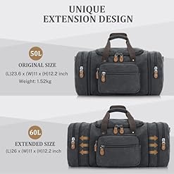 Expandable design: Canvas Travel Duffel Bag measures (L)23.6 x (W)11 x (H)12.2 inches and can be extended to 26 inches with two side zippers. Perfect for carrying on flights as carry-on luggage