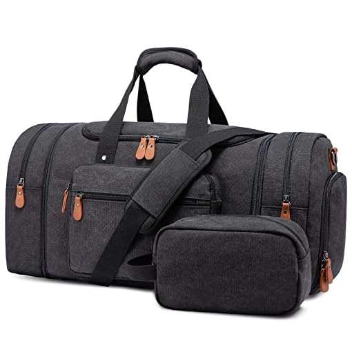 【Travel Bag & Free Toiletry Bag】: Our duffel bag is made of high density cotton canvas and classical hardware, soft lining, large smooth zippers. Since it is made of canvas, it is not waterproof.The duffel bags also come with a 15USD toiletry bag that is convenient for the people who love travelling. The toiletry bag can be keep your travel essentials organize while you travel without messing up your stuffs. The size of toiletry bag is 9″ (23 cm) * 4.5″ (11cm) * 5.9″ (15 cm).