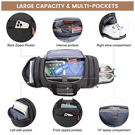【Large Capacity & Laptop Compartment】: Duffel bags for travelling interior with 1 zipper pocket, 2 outer pockets,1 padded ipad pocket and a laptop compartment. Exterior with 1 side zipper pocket, 2 front zipper pockets and 1 back zipper pocket. It can fit in 3-4 days of daily essentials such as clothes, shoes, umbrells, 15″ laptop, IPad Air and other electronic devices.
