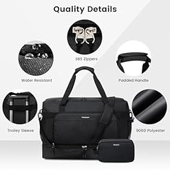 Quality materials: Made of 900D quality polyester, this large duffle bag for travel is lightweight, odorless, and sturdy for long-term use. Besides, with a water-resistant surface, the duffel bags for traveling can keep your items from splashed water