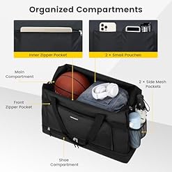 Separate compartments: This duffle bag for men has a serparate compartment on the bottom for your shoes or dirty clothes. With a front zipper pocket, you can easily access your passport, phone, glasses, and other small items. Besides, this weekender travel bag has two side mesh pockets for your water bottle and umbrella
