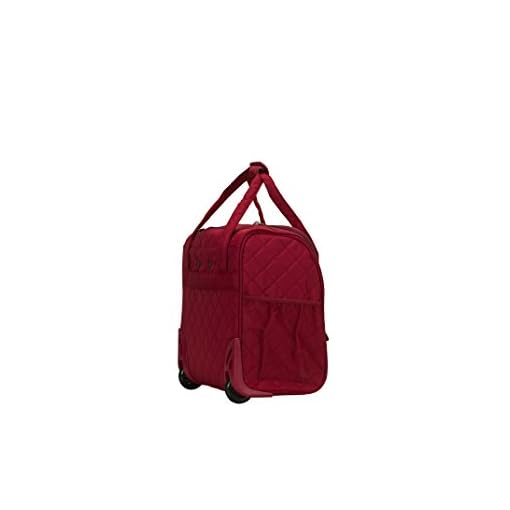 Carry all your essentials in style and comfort with the Rockland wheeled under seat carryon bag. Quilted polyester fabric exterior features a large main compartment for clothes, shoes and also has 2 slip pockets and two zippered pockets for keeping small essentials handy and organized. Retractable handle stores away while hand held handles allow for quickly grabbing bag from overhead bin or underneath seat. Back side has a strap allowing you to attach it to your wheeled carry on piece. This makes the perfect bag for overnight trips and the small size fits under near most airline seats allowing you to carry on your bag even when overhead bins are full.
