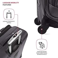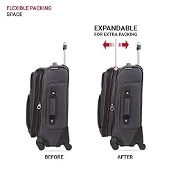 SwissGear Sion Softside Expandable Carry-On Spinner Luggage gives you an ample amount of packing space when needed. This rolling suitcase features a locking push/pull handle system and four 360-degree multi-directional spinner wheels for convenient portability. It is made from a durable, scuff-resistant polyester fabric and its interior is fully lined. This carry-on suitcase features adjustable luggage tie-down straps for securing garments in place, a removable zippered wet bag, a large mesh lid pocket, and a packing pocket for holding small items and accessories. It also includes two front panel pockets, a built-in ID tag, and padded top and side handles. At SwissGear, we continue to ensure whatever you need travels easily, safely, and stylishly with you. Great for a family trip or business travel.