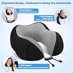 【Premium Memory Foam & Breathable Cover】 CloudBliss travel pillow is made of premium memory foam that is soft and supportive to fit the curve of your neck. The travel neck pillow is also covered with a layer of breathable cloth for a more comfortable rest!