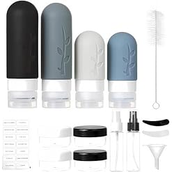 Designed for Travel Accessories: Our 18 pack reusable travel bottles set with 1 waterproof bag, 2 pcs silicone bottles (3 oz/90 ml), 2 pcs silicone bottles (2 oz/60 ml), 2 pcs spray bottles (1.05 oz/30 ml), 4 pcs cream jars (0.35 oz/10 ml), 1 pcs funnels, labels, brush and 2 pcs spatula! Different accessories for your different needs